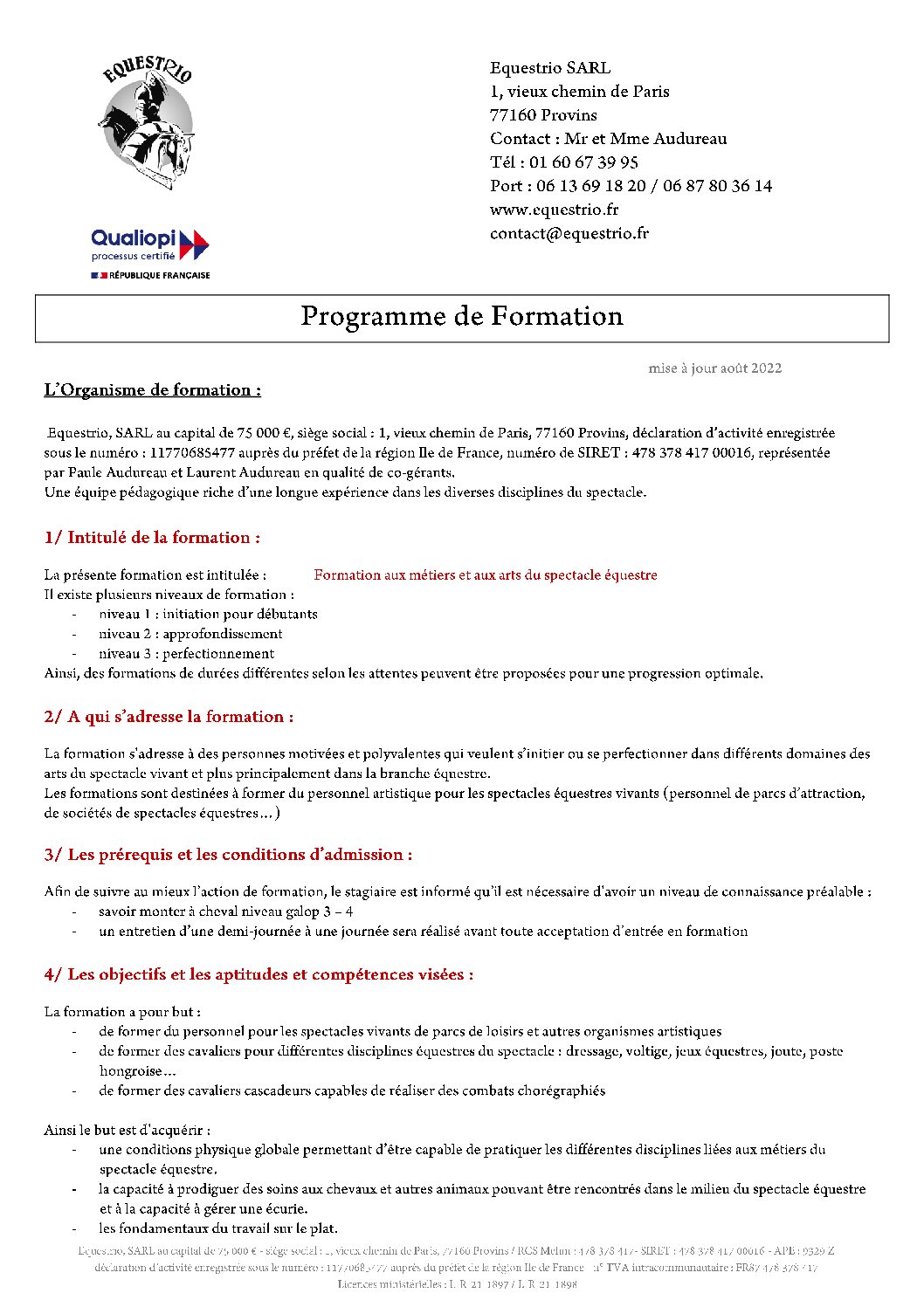 Objectifs pédagogiques et compétences visées : A l’issue de la formation, les participants seront capables de réaliser des figures de voltige, des jeux équestres, des figures de dressage, des combats à l’épée, des cascades mais aussi de prendre soin d’un cheval, effectuer des figures de jonglage, incarner un personnage sur scène, etc.